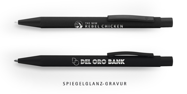 Das tiefschwarze Design bildet die perfekte Bühne für Ihre Werbebotschaft. Besonders eindrucksvoll wirkt die spiegelnde Lasergravur, die sich kontrastreich vom matten Gehäuse abhebt. So entsteht ein außergewöhnlicher Look, der sofort ins Auge fällt.